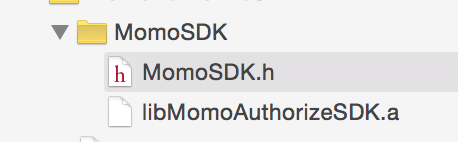 [3] 添加工程SDK文件到工程,将下载的MomoSDK文件夹添加至工程,其中包含libMomoAuthorizeSDK.a 和MomoSDK.h两个文件。